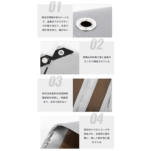 【製品の利点】防水シート採用するPEポリエチレン原材料+両面コーティング防水層技術、防水率99.99%、密度が60%上昇しました、ハスの葉のデザインに似せて、新技術、防水を倍にする。高編み密度、高温ヒートシール二重層エッジング、厚みのあるエッジングコーナー、引き裂き抵抗。四辺は約1メートルおきに金属の穴を設計する、亜鉛めっき加工を施し防錆び・防腐食性を高めました