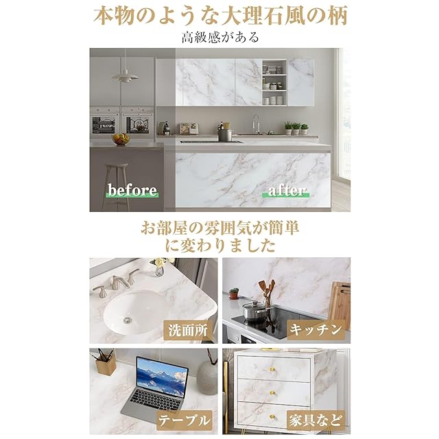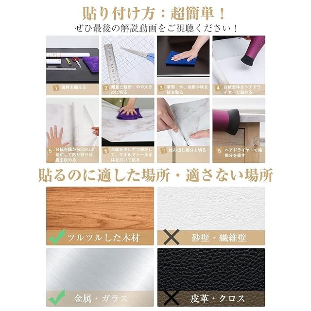 【簡単貼り付け&賃貸OK】裏紙を剥がして貼るだけ!貼り道具を持っていない初心者でも綺麗に貼れます。貼ってはがせるシールタイプなので、剥がした時も糊残らず、賃貸住宅でもお手軽に利用できます。※貼る面の素材によって、貼る面にのりが残る場合があります。原状復帰が求められる賃貸住宅でのご利用は十分ご注意ください。【用途】お部屋の壁、キッチン、浴室、トイレ、家具、テーブル、扉、古くなった家具の再生、小物のdiyやアクセサリの撮影用など様々な場所に活用!水や汚れを心配せず、ご家庭やオフィスの所々もアレンジできます。
