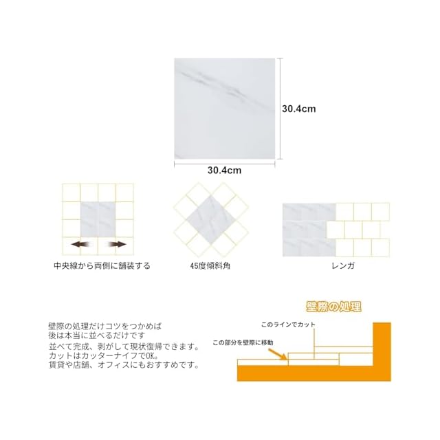 【施工が簡単】バックゴムの保護フィルムをはがせば、床に貼り付けることができます。床タイルを並べて敷設するだけです。 ハサミを使って好きな形に切ることもできます。 初めて施工する人や女性でも簡単に操作できます。