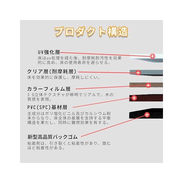 【本物そっくりの木目を再現】リアルな木目、エンボス加工による立体感、リアルな木目のような再現。フロアタイルの表面は防水加工されていて、水がついても浸透しない。 バックゴムは帯状のデザインで、接着力が強く、しかも裏面に接着剤が均一で、施工がより簡単です。 重い家具を置いても、床がずれない。 バックゴムの保護フィルムは環境に配慮した透明接着材でできており、より軽量である。
