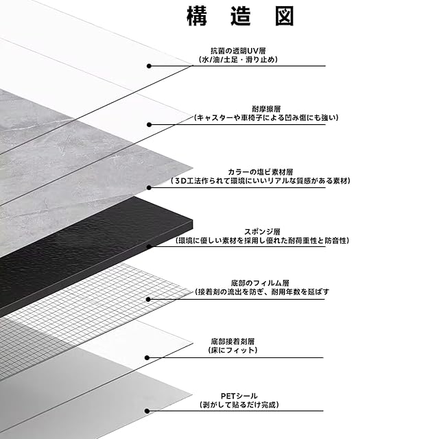 【施工簡単のフロアシート】この石目調フロアシートは裏側に滑り止め加工がされているため、ノリやテープなどの接着剤なしでも粘着シールを貼るだけでしっかり床に張り付きます。適度な重みとしなやかさがあるため、浮くことなく床面にフィットします。床に置くだけで施工完成します。素人にも簡単に取扱います。賃貸におすすめです。