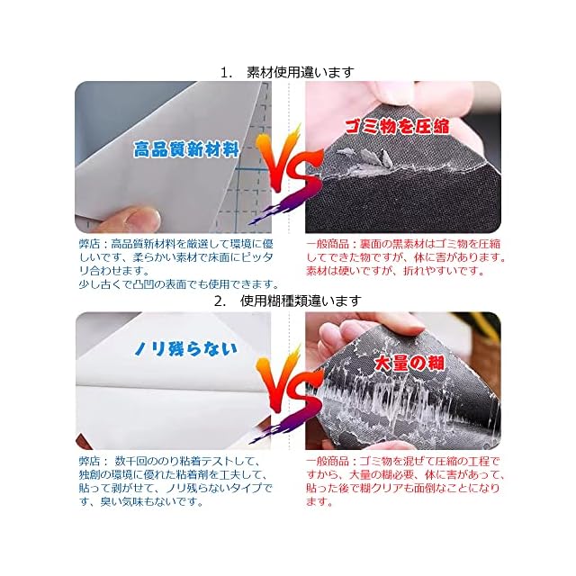 【のり残らない】のりでも自社特別技術で生産しております、数百回以上のテストリメイクを試験して、剥がしてのり残らなくて傷つけることなく、適切な強度のりを選び抜きました。回復可能です、賃貸最適。【ボロ床隠し】ザラザラの旧い床、少し凸凹のフロアタイルの上にも貼れますが、柔らかいPVC新素材から、カッターで寸法通りに切断しやすくて、角の所でもキレイ貼れます。