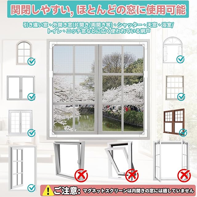 【サイズ調整・取り付け簡単】:お手持ちの窓のサイズに合わせて自由にカット可能、日本の建物における多くの小窓に適しており;粘着テープ付きマグネット式でドリル不要;木製・鉄製・アルミ製などあらゆる窓枠に対応。ご注意:窓枠のサイズを正確に測ってからご注文ください。取り付け前に必ず説明動画をご確認ください