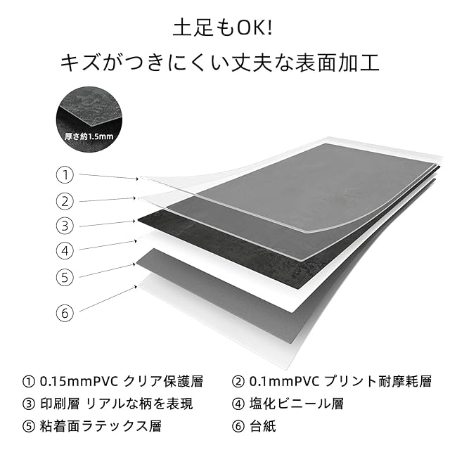 【高品質】環境に優しいビニール製床材で、本体にしっかり厚みと重量があり、プロのフローリング材です。表面にはPVC材で、抜群の耐摩耗性を持ちます。椅子やテーブルを移動する時にも傷が付きにくく、土足でも丈夫なフロアタイルです。表面には防水コーティングがあり、お掃除が簡単です。