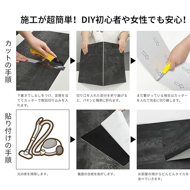 【施工簡単】裏面には粘着性があり、滑らかで乾燥した平面にシールのように床にペタッと貼るだけです。お部屋の形に合わせて、カッター1本で加工できるのでDIY初心者でも安心!女性でも簡単に施工できます。