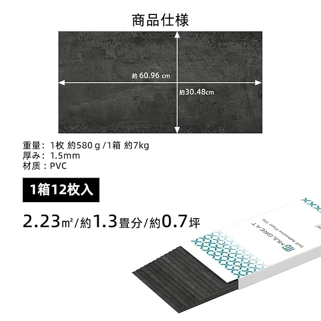 【製品仕様】1枚あたりサイズ:約60.96cm×30.48cm 厚さ:1.5mm 1枚あたり重量:約0.58kg 梱包重量:約7.2kg デザイン:石目調フロアタイル セット数:12枚セット(約1.3畳分) 素材:安全なPVC素材