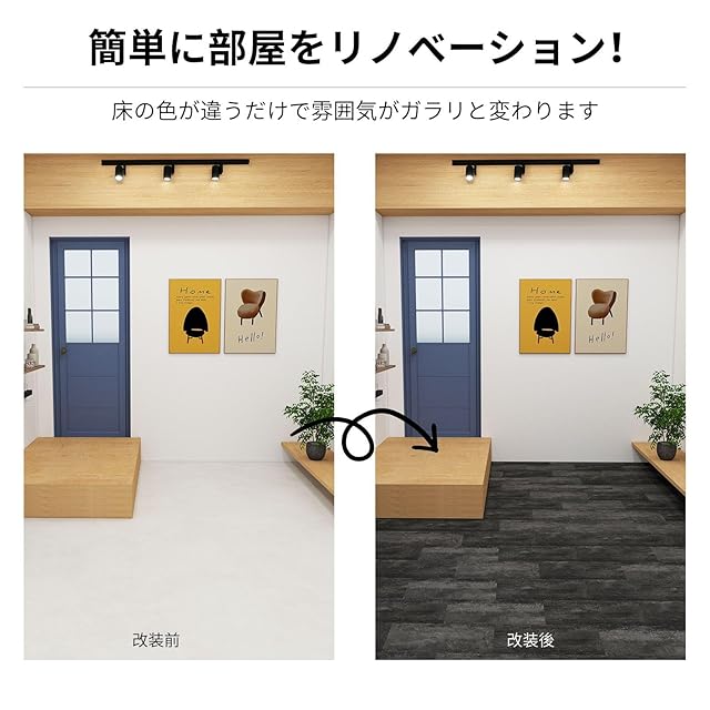【応用広い】賃貸の部屋、玄関、洗面所、トイレ、店舗などいろいろな空間で使えます。インテリアのベースとなる床を張り替えることで、お部屋の雰囲気をガラリと変えてくれます。また、予算も節約できます。