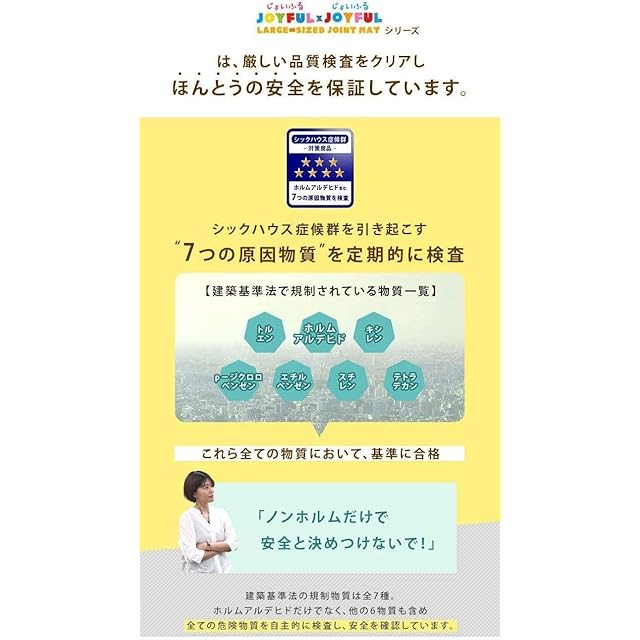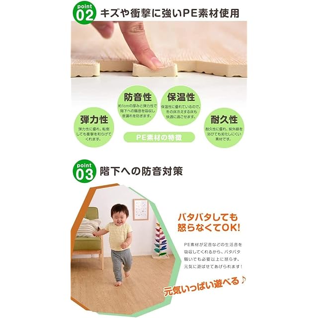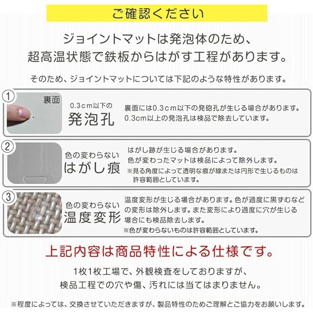 【備考】※マット毎に若干の色の違い、見る角度による色の違い等がありますが、これはPEマットの加工特性であり、使用上の品質には問題ございません。 ※生産上マットをカットする際に生じた粉末が付着している場合がございます。一度綺麗に水拭きしてからご使用ください。色落ちではありませんので、ご安心ください。 ※重量物を載せますと、マットが凹み変形する恐れがあります。 ※床暖房の種類等によって、商品に多少の反りが生じる場合がございます。予めご了承ください。 ※ロットによって色味が異なる場合がございます。2019年1月10日に素材をEVAからPEに変更しました。