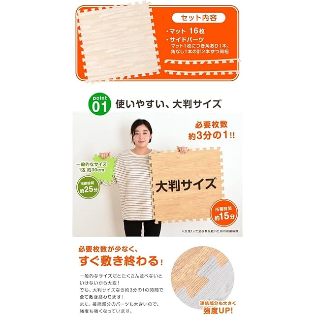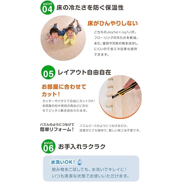 【備考】・マット毎に若干の色の違い、見る角度による色の違い等がありますが、これはPEマットの加工特性であり、 使用上の品質には問題ございません。 ・生産上マットをカットする際に生じた粉末が付着している場合がございます。一度綺麗に水拭きしてからご使用ください。 色落ちではありませんので、ご安心ください。 ・重量物を載せますと、マットが凹み変形する恐れがあります。 ・床暖房の種類等によって、商品に多少の反りが生じる場合がございます。予めご了承ください。 ・ロットによって色味が異なる場合がございます。 ・商品の仕様上、ジョイント部分(サイドパーツ含む)の木目の柄は合わない場合がございます。 ・PE素材の特性上、使用するうちに負荷がかかる部分に多少のへたりが生じる場合がございます。 そのため、既に使用しているマットに新しいマットを繋げて使用する際、上手く繋がらない場合もございますので、予めご了承ください。
