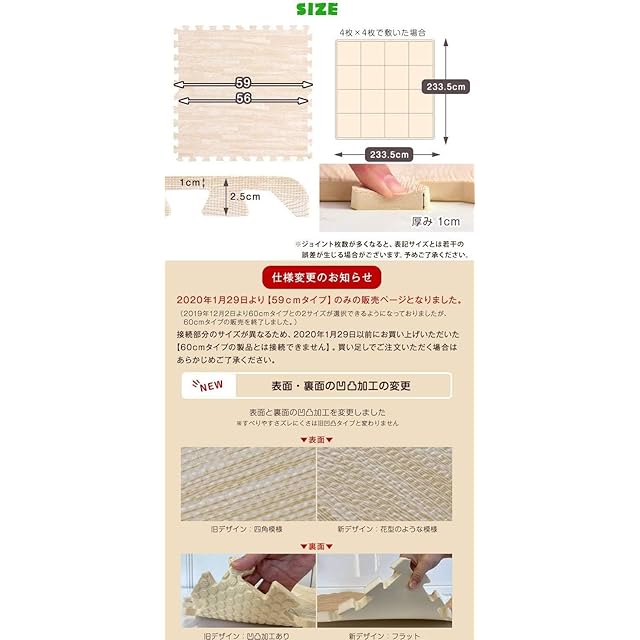 2019年1月10日に素材をEVAからPEに変更しました。 ・床材(塩化ビニル・フローリング等)によって、色移りや変色が起こる場合がございます。床とマットの間に敷物や防護シートを敷いていただくことを推奨しております。 ※2020年2月26日より商品ページでの「大判58cmタイプ」の表記を「大判59cm」に変更をしました。 実際の商品サイズに変更はございませんので、過去58cmタイプをお買い上げいただいたお客様は、そのまま接続が可能です。
