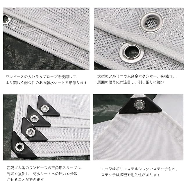 【エッジ補強】防水シートは縁に内紐仕様の3次元ヘミングデザインを持っていて、エッジは厚く、4つの角は黒い三角形で強化され、錆びの防錆ボタンホールがあります。しっかりと固定することができます。一枚原反を使用し繋ぎ目がない為、タープ等で使用した際に見栄えが良いです。