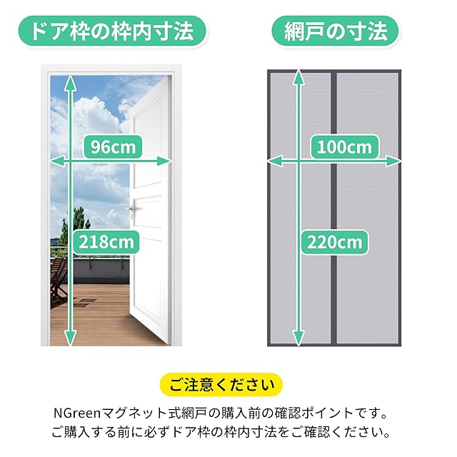 【網戸の選び方】網戸のサイズ:100x220cm。ドア枠の枠内寸法は取り付けられる網戸のサイズに繋がりますので、ご購入前に必ずドア枠の枠内寸法をご確認ください。
