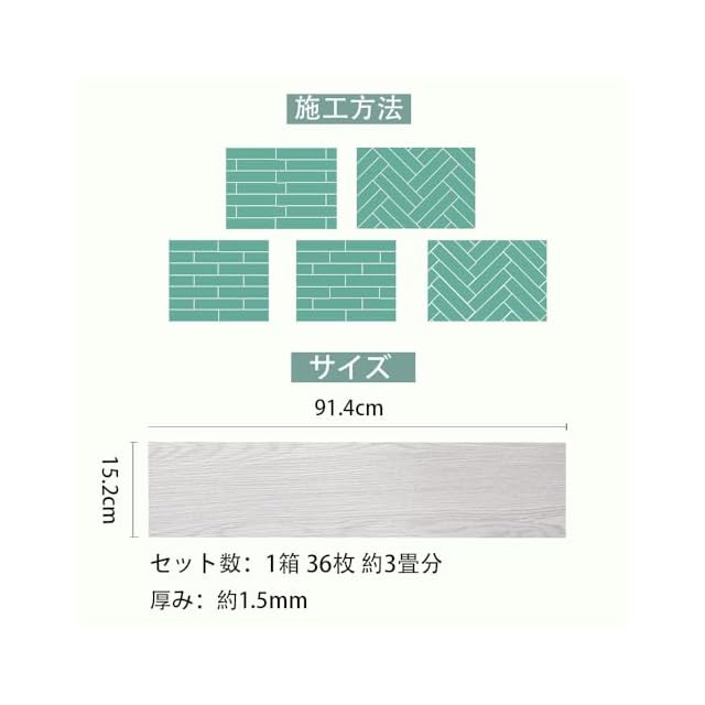 【商品仕様】一枚長さ:約91.4cm×15.2cm、厚み:約1.5mm。セット数:1箱 36枚 約3畳分 重量:1セット 約15KG