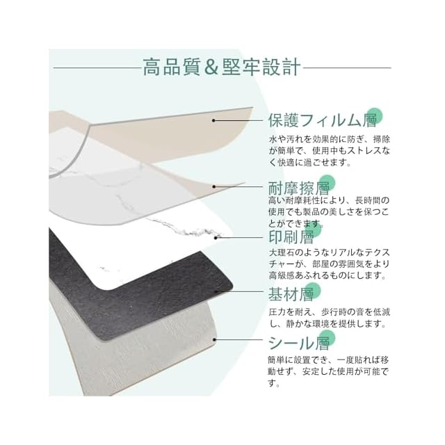【傷防止・防水・床暖房対応】高品質PVC素材を使用し、防水・防湿性に優れ、掃除も簡単で、汚れをすぐに落とせます。傷防止機能付きで耐久性が向上し、床暖房にも対応しています。
