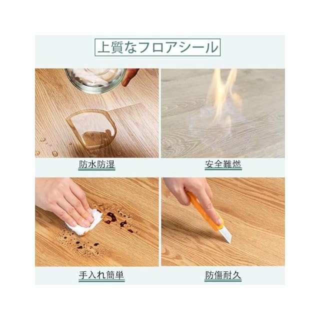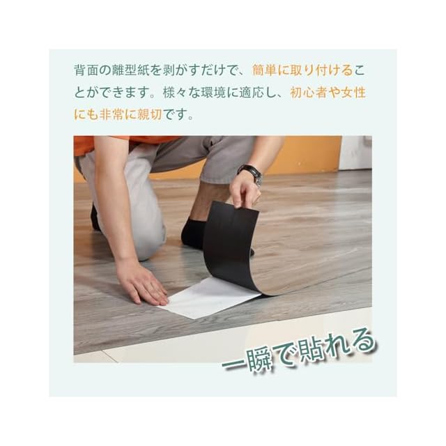 【貼るだけで簡単・DIY可能】背面の透明フィルムを剥がすだけで、付属の強力な接着剤で簡単に床に固定できます。追加の接着剤や工具は不要で、初心者や女性でも簡単に施工でき、自由にカットして場所に合わせて調整できます。(注:シール跡は「のり取りクリーナー」で拭き取れます。完全回復を希望する場合、貼る前にCFシートや養生テープを使用することをお勧めします。)