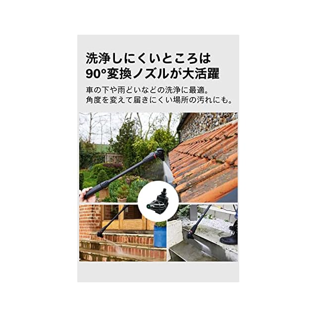 車の下や雨どい、2階の窓などの洗浄に活躍する「90度変換ノズル」