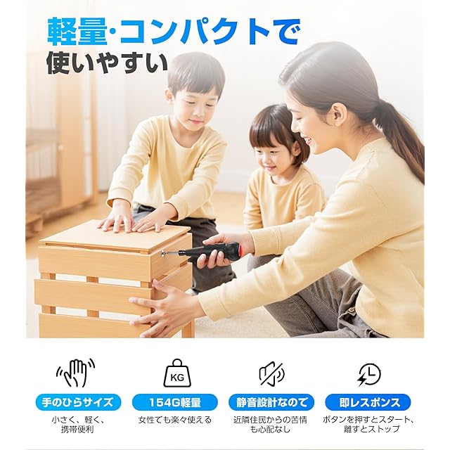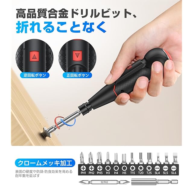【最新強化版電動ドライバー・手動兼用】この電動ドライバーは全銅モーターを使用しており、パワーが強く、寿命が長くなります。指一本で正回転・逆回転を自由に切り替えられます。最大トルクは電動で4N・m、手動で12N・mです。プロユースとしてだけでなく、家庭での普段使いでも最適。滑り止めボールグリップは使用中に持ちやすく、滑りにくく、締め付け性能が良く、重さはわずか156gで、長時間使用しても疲れにくく、取りやすいです。女性やお年寄りでも簡単にご利用いただけます。