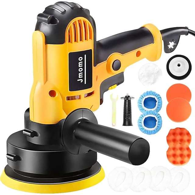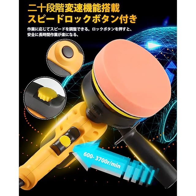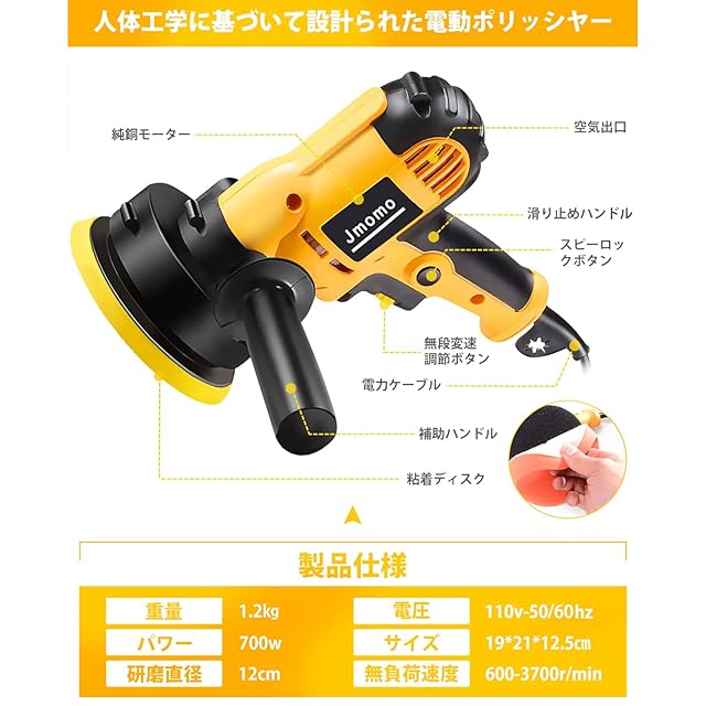 Jmomo ポリッシャー 電動ポリッシャー 車 125mm 二十段変速可能 強力モーター 研磨機 サンダポリシャー 軽量 車磨き ワックス作業 塗装面用 家庭用 艶出し 傷消し 研磨パッド付き スポンジセット付き (イエロー) | つむぎ屋