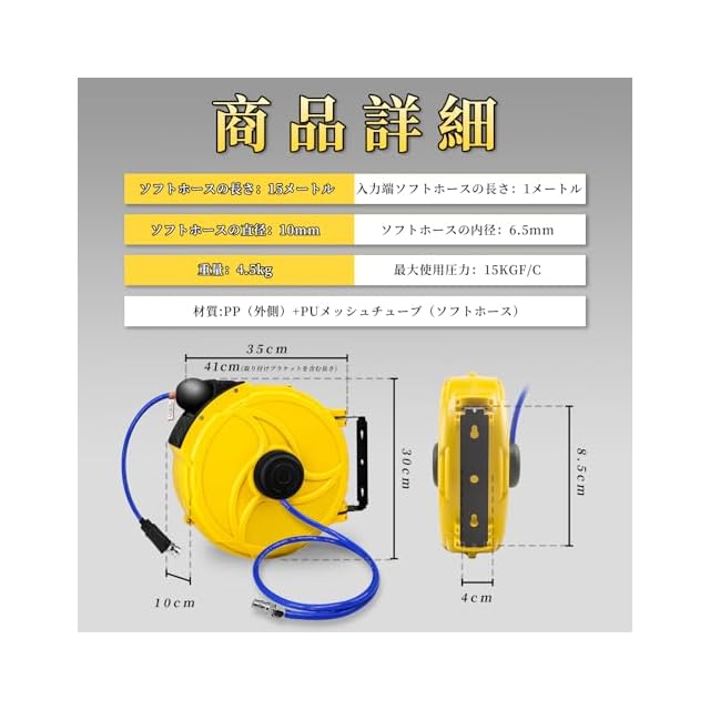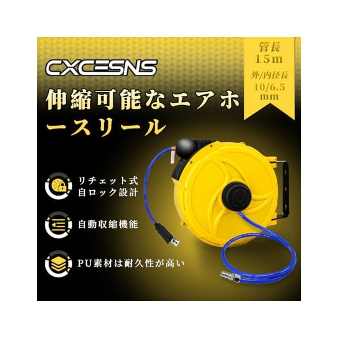 CXCESNS エアホースリール 15m 自動巻取式 壁掛け オートリール 回転可能 エアホース 吊り下げ式 ツールパワー 壁掛け対応 ホース外径φ10mm×内径6.5mm 空気圧工具 エアダスター エアコンプレッサー 自動巻き取り 耐久性 ソフトホース 自動巻きエアーリール オートエアー PU オート引き込み式 日本語説明書付き 最高使用圧力15kgf/c ブラケット付 セーフティソフト | つむぎ屋