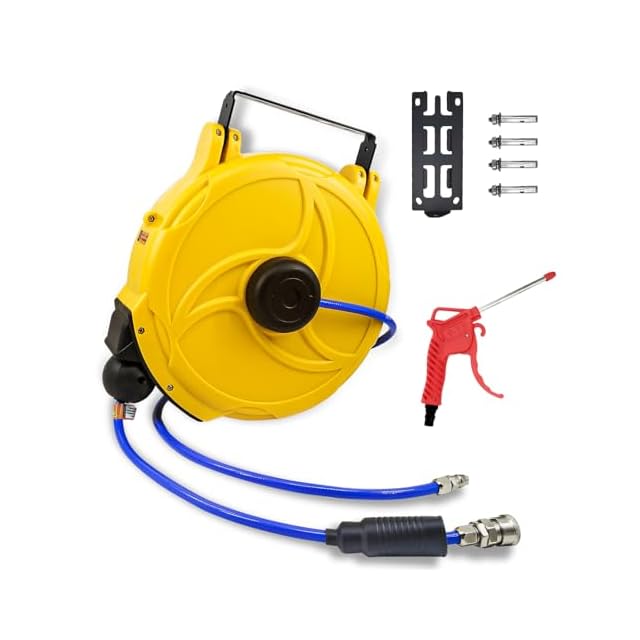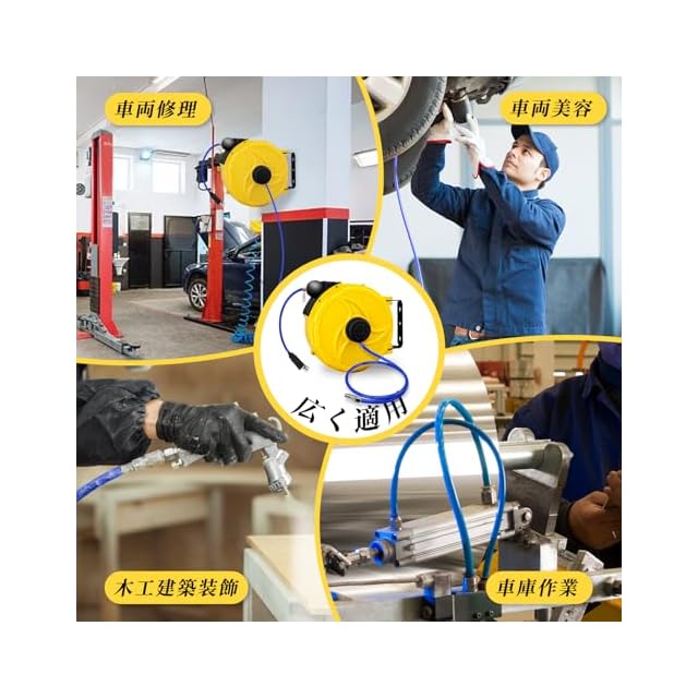【様々な空気工具に適応】エアホースリールは、さまざまな空気工具や機器を間接的に接続するためのツールで、空気工具の効率を最大限に高め、さまざまな作業をサポートします。エアコンプレッサー、エアネイルガン、エアダストコレクター、エアドリル、エアグラインダーなどの空気工具と互換性があります。