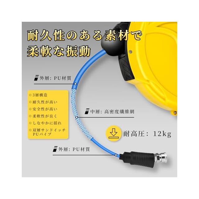 【12mのロングサイズ】ホースは全長12メートルで、屋外作業でも十分に対応可能。コンパクトなデザインで移動時にも持ち運びやすく、自動車整備工場などの場所での利用に適しています。