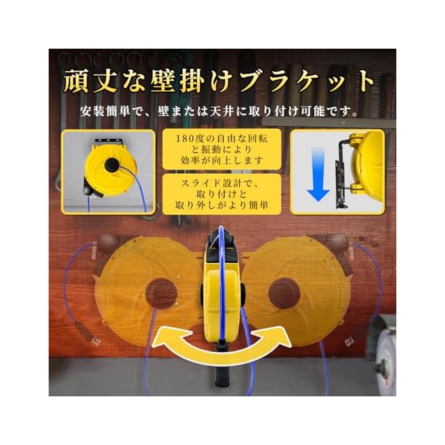 【幅広い用途】専用の壁掛けブラケットを提供し、壁面や天井等に簡単に取り付けられます。壁への取付部分は180°左右に回転可能、特定の角度に制限されず、幅広い範囲に対応できます。エアーホースはホースを整然と収納できるため、散乱しているホースよりも通常は占めるスペースが小さく、家庭や庭、ガレージなどの限られたスペースに適しています。