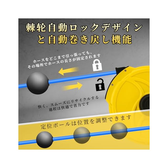 【 ラクラク自動巻取り機能で作業効率アップ】:ホースの長さは自由に調節可能。使用後は軽く引くだけで、スムーズに自動で巻き取られるので手間いらずです。過剰巻取り防止機能付きで安心です。