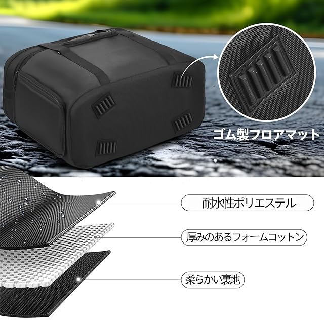 [全方位保護設計] 耐水性ポリエステル + 厚めのフォームコットンで、衝撃・雨・塵から電源を保護。ゴム製フロアマットで滑り止め&底面衝撃吸収。