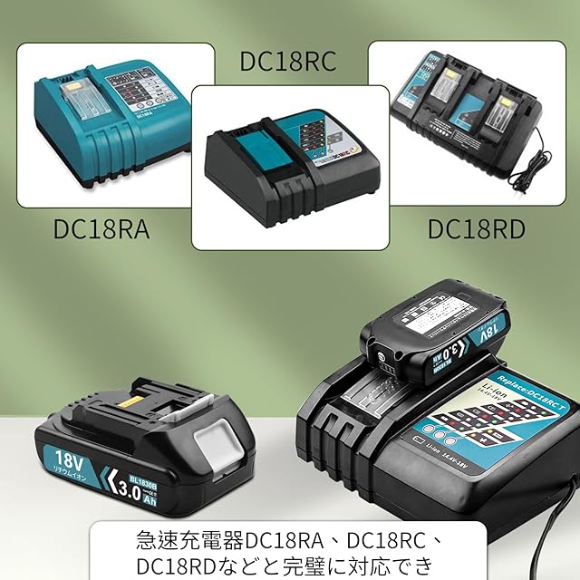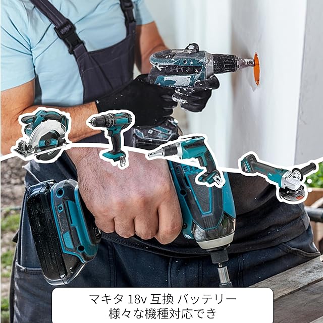 マキタ互換バッテリー18v対応のバッテリー:BL1815B、BL1820B 、BL1840B、BL1850B、BL1860B、BL1870B、194205-3、194230-4、LXT400などに対応できます。(ご注意ください。弊社のバッテリーはDC18RF充電器に対応できませんが、それ以外のマキタ18 V充電器は対応できます。)
