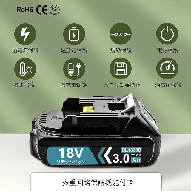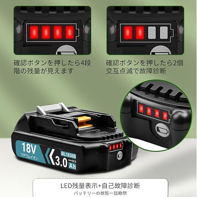 商品仕様:互換マキタ バッテリー 18v 型番:BL1830B(薄型) 電圧:18v 容量:3000mAh LEDランプ残量表示+自己故障診断 マキタ互換電池 安定性に定評のある。