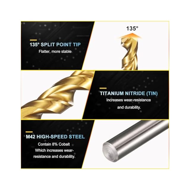 特徴:M42高速鋼は、高8%コバルト、高硬度、耐摩耗性で形成されており、特に硬材の加工に適しています。優れた耐熱性を持ち、高速切削に適しています。チタンニトリド(TiN)コーティングは、ドリルビットのさらなる酸化や腐食を防ぎ、寿命を延ばすことができます。