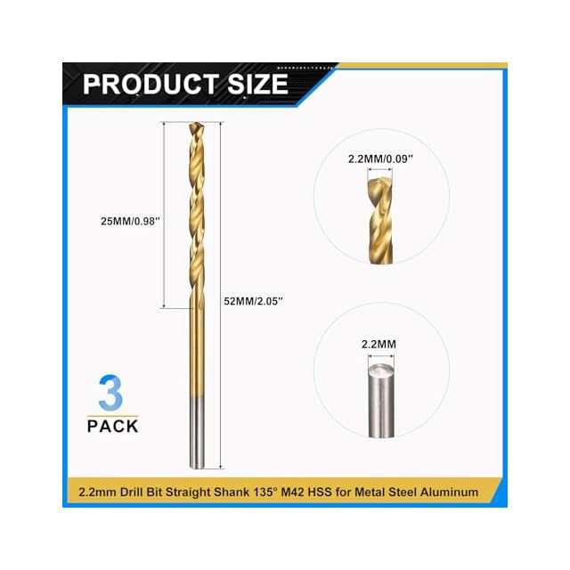 パッキングリスト:2.2mm(0.09インチ≈3/32インチ)カッティング直径、25mm/0.98インチフルート長、52mm/2.05インチ全長、135度分割点のドリルビット3パック