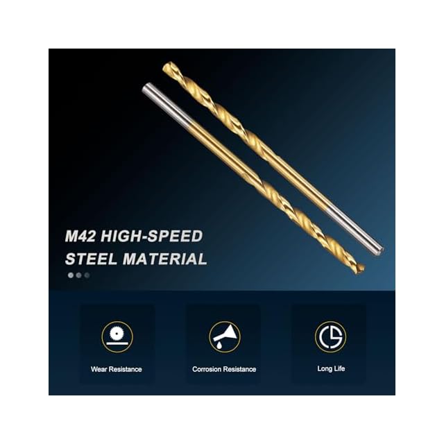 特徴:M42高速度鋼は、高8%コバルト、高硬度、耐摩耗性で形成されており、特に硬材の加工に適しています。優れた耐熱性を持ち、高速切削に適しています。チタンニトリド(TiN)コーティングは、ドリルビットのさらなる酸化や腐食を防ぎ、寿命を延ばすことができます。