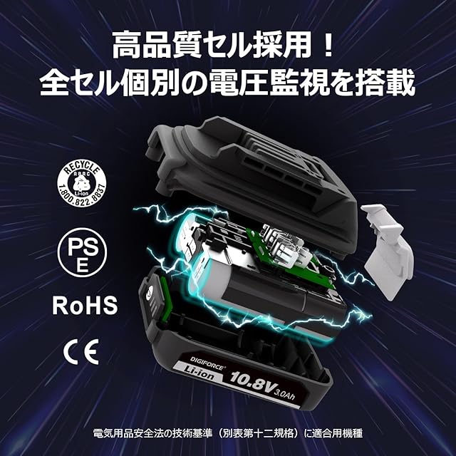 【充実の安全保護機能で安心してご使用可能】内部に高度な保護回路を搭載。過充電、過放電、過電流、短絡(ショート)、過熱からバッテリーと工具を守り、あらゆるシーンでの安全性を確保しています。PSE認証を取得しており、日本の安全基準にも適合しています。