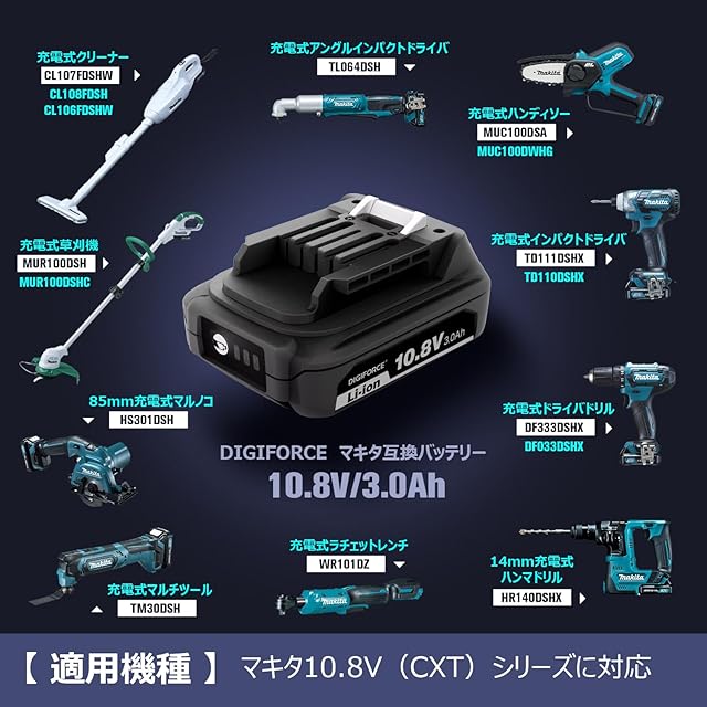 【適用機種】マキタ10.8Vスライド式(CXT)シリーズの電動工具・クリーナー等の機種に対応しています。充電式クリーナー:CL107FDSHW・CL108FDSH・CL106FDSHW/充電式アングルインパクトドライバ:TL064DSH/充電式ハンディソー:MUC100DSA・MUC100DWHG/充電式インパクトドライバ:TD111DSHX・TD110DSHX/充電式ドライバドリル:DF333DSHX・DF033DSHX/14mm充電式ハンマドリル:HR140DSHX/充電式ラチェットレンチ:WR101DZ/充電式マルチツール:TM30DSH/85mm充電式マルノコ:HS301DSH/充電式草刈機:MUR100DSH・MUR100DSHC 等