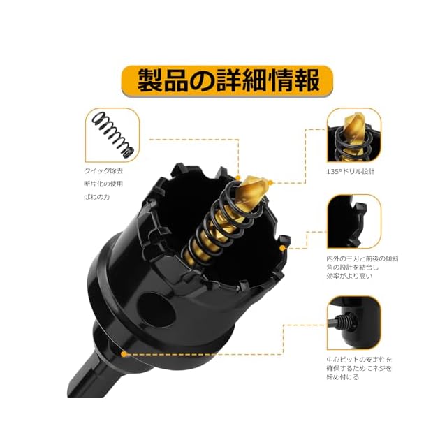 【用途】電動ドリル、ボール盤に使用可能。センタードリル・六角レンチ付き(センタードリルはシンニング加工によりポンチングが不要です。)