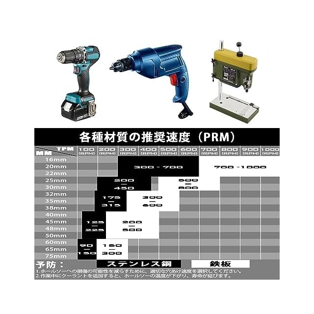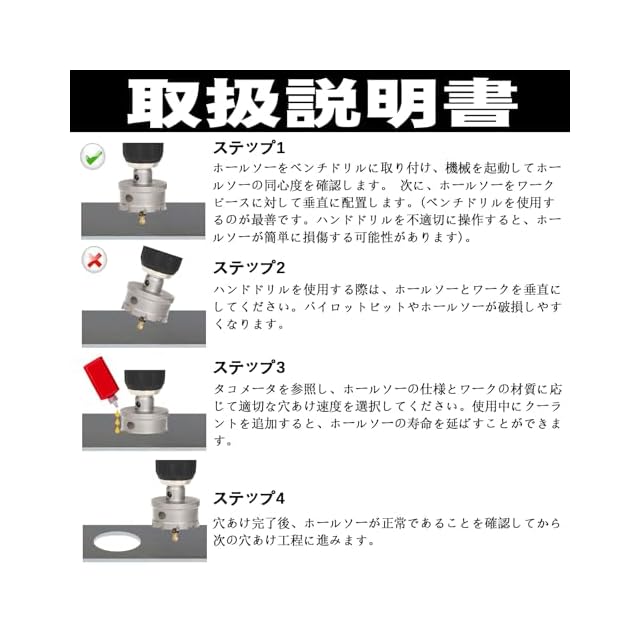 注意: 低速で切断を開始してください。ホールソーはワークピースに対して垂直である必要があり、ドリルビットの損傷を避けるために傾けないでください。 金属を切断する場合は、クーラントまたは水を加えて作業することをお勧めします。 ご使用の際はゴーグル、フェイスシールド等の保護具を着用してください。