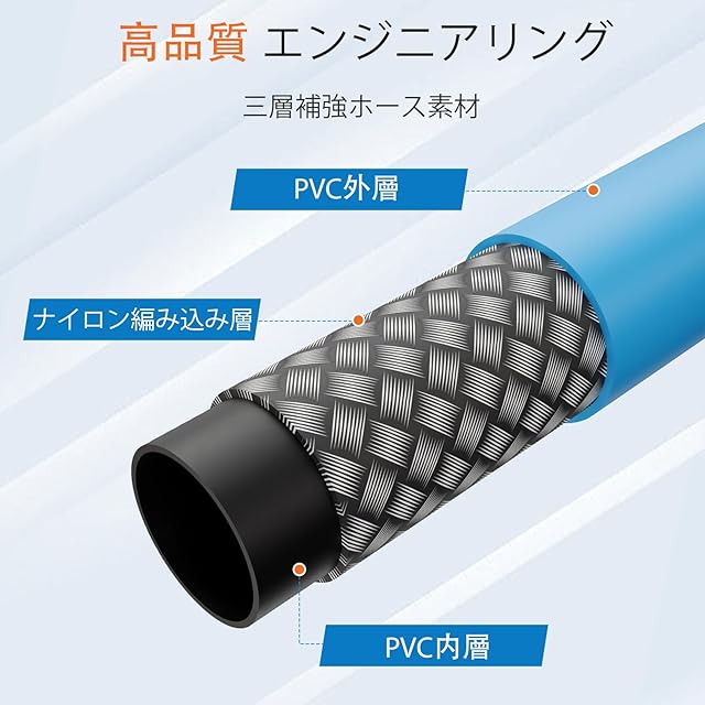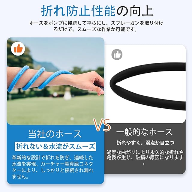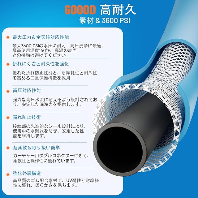 【超柔軟性】業界先進の設計により、優れた柔軟性を実現し、水流をスムーズに保ち、高効率な洗浄が可能です。取り回しが簡単で、使用後はすぐに元の形状に戻ります。プロのアドバイス:開封後はホースを平らにして全長を伸ばすと、テンションが緩和され絡まりにくくなります。