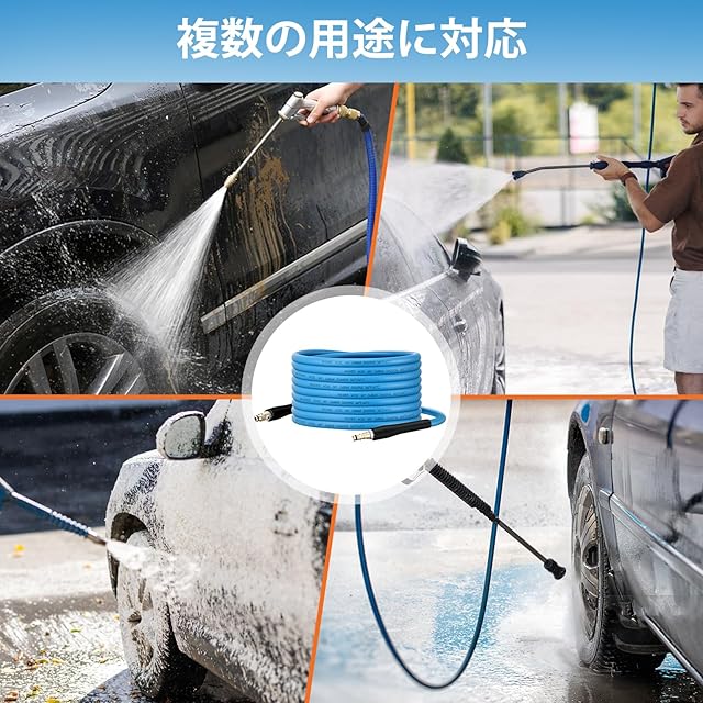 【超柔軟設計】高度な業界技術に基づいて設計されたこの高圧洗浄ホースは、優れた柔軟性を提供し、スムーズな水の流れと高効率な清掃を可能にします。操作性が高く、巻き取りも簡単で、使用後はすぐに元の形に戻ります。 プロのヒント:開封後はホースを平らにして全長を伸ばすことで、テンションが解放され絡みにくくなります。