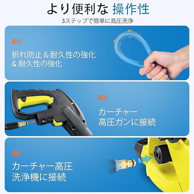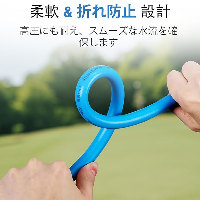 【大幅に改善された折れ耐性】アップグレードされた柔軟な構造で優れた折れ耐性を実現し、水流の中断を防いで効率的な洗浄作業をサポートします。強化された外層シースは耐摩耗性が従来の2倍で、優れた耐久性を提供。さらに、非マーキング表面により、洗浄面にシミや傷が付かず、清潔に保てます。