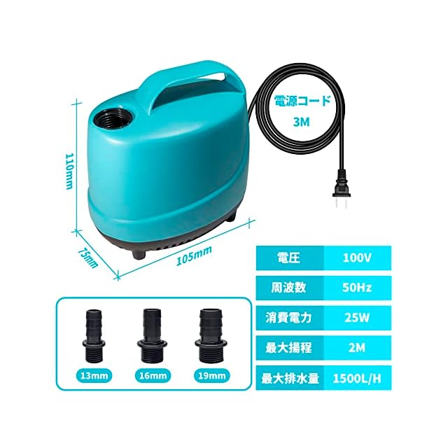 電源:AC 100V 周波数:50Hz 消費電力:25W 最大吐出量:1500L/H 最大揚程:2M 防水:IPX8 海水対応:可