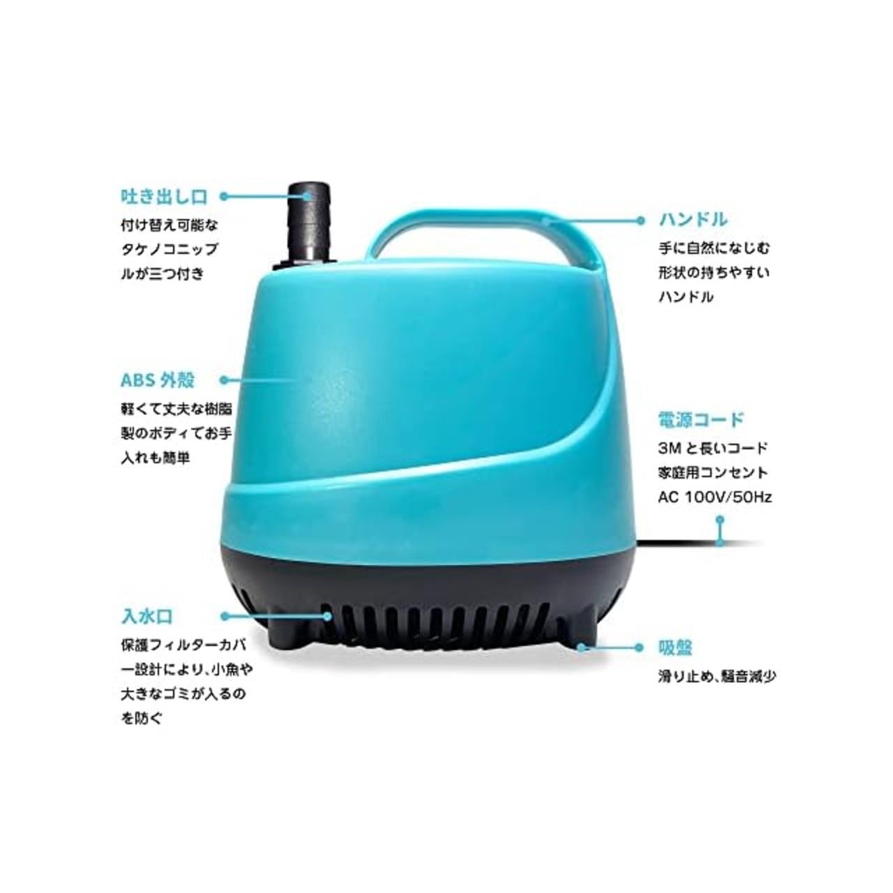 電源:AC 100V 周波数:50Hz 消費電力:45W 最大吐出量:3000L/H 最大揚程:3M 防水:IPX8 海水対応:可