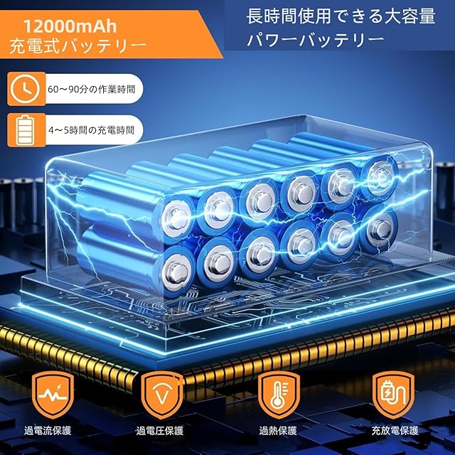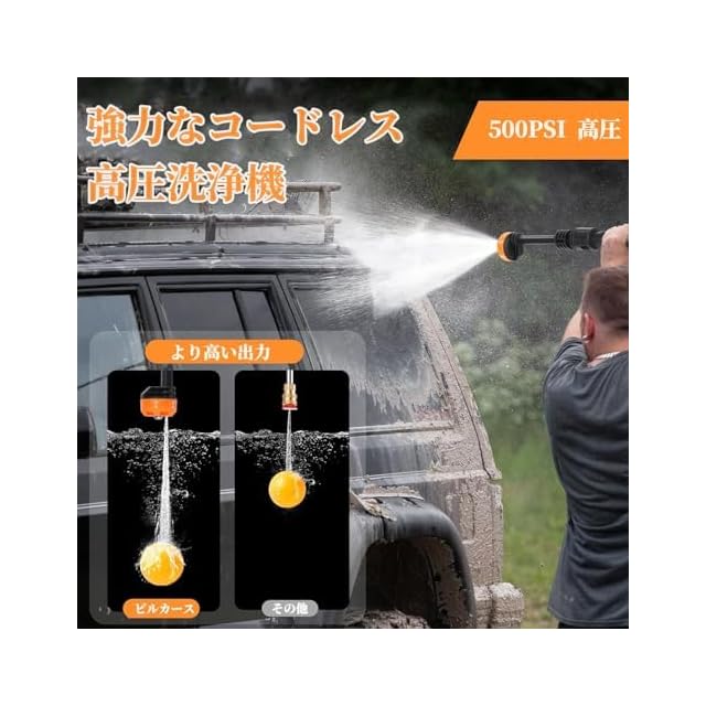 強力なコードレス高圧洗浄機:最大圧力500PSIのコードレス高圧洗浄機で、短時間で素早く効率的に清掃できます。12000mAhの大容量バッテリーを搭載し、フル充電後に30分以上の連続使用が可能です。さらに、充電式設計のため電源に接続する必要がなく、より便利に使用できます。