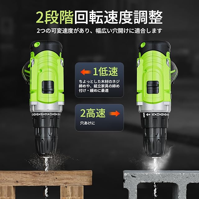 【24+1段階トルク調整 & 2段変速】 精密な作業から力仕事まで、24段階のトルク調整と2段変速で繊細にコントロール。ネジ頭や素材を傷つけず、プロ並みの仕上がりを実現します。