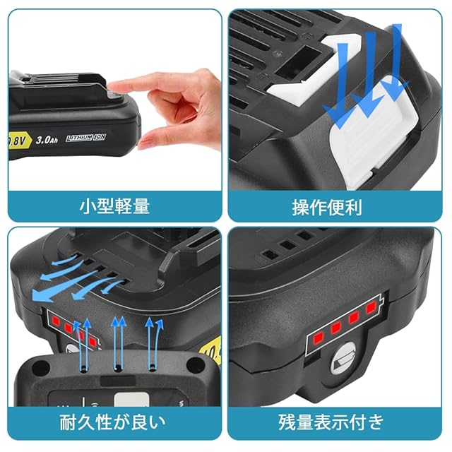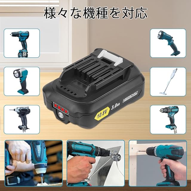 型番:WTL1015 マキタ10.8v 互換バッテリー 電圧:10.8v 種類:リチウムイオン電池(Li-ion)残量表示:残量表示インジケータ付きの新型バッテリーで、バッテリー残量や残り使用時間がひと目で分かります