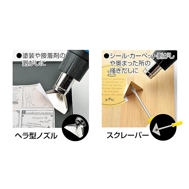 【豊富なノズルアタッチメントで幅広い用途にも対応、持ち運びに便利な収納ケース入】セット内容:本体(HG-1450A)×1、ワイドノズル×1、スポットノズル×1、フックノズル×1、ヘラ型ノズル×1、スクレーパー×1、スクレーパー固定具×1、収納ケース×1、取扱説明書×1