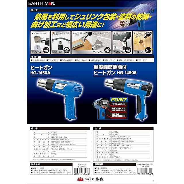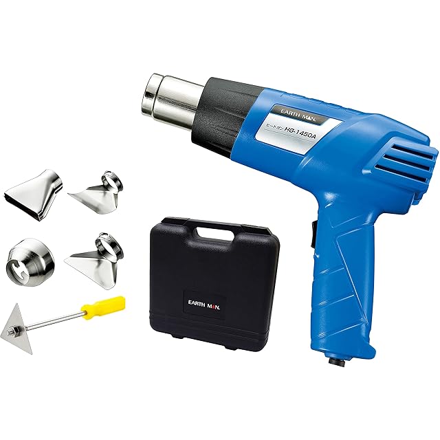 高儀(Takagi) EARTH MAN ヒートガン 小型 豊富なアタッチメント付属 温度や風量調整可能 シュリンク包装、塗料乾燥、曲げ加工、カーフィルム施工など HG-1450A