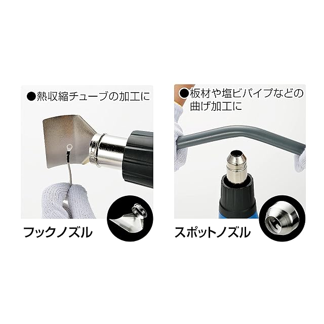 【熱風を利用してシュリンク包装・塗料の乾燥・曲げ加工など幅広い用途に】熱収縮チューブの加工、板材や塩ビパイプなどの曲げ加工、シュリンクフィルムの収縮に、熱硬化性塗料やパテの乾燥、塗装や接着剤・シール剥がし、シール・カーペット剥がしや奥まった所の掻き出しに