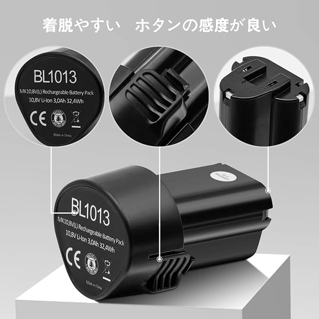 商品説明:<br>型番:マキタBL1013 対応・互換バッテリー<br>電圧:10.8V<br>容量:3000mAh (3.0Ah)<br>種類:リチウムイオン電池<br>認証:PSE・CEマーク<br>:一年<br>保護機能:過電流、過充電、過放電<br>交換可能バッテリー:<br>BL1013 /194550-6 /194551-4 /195332-9 /BL1014<br>対応充電器: <br>DC10WA<br><br>対応機種<br>Makita MU シリーズ:MU01、MU01Z、MUH260D、MUH260DW、MUH260DZ、MUM164D、MUM164DW、MUS052D、MUS052DW、MUS052DZ<br>ドライバトリル: DF030D、 DF030DFE、 DF030DWE、 DF030DWX、 DF330D、 DF330DFE、 DF330DWE、DF330DWLX、DF030DWX<br>クリーナー:CL100D、CL100DW、CL100DWX、CL100DZ、CL100DZX、CL102D、CL102DW、CL102DZ、CL102DZX<br>インパク<br>トドライバ:TD090D、TD090DWE、TD090DDWX、TD090DWXW<br>グスシェア:UM164DW、UM164DWE、UM164DWEXL、UM164DZ<br>ジグソー:JV100DWE、JV100DZ