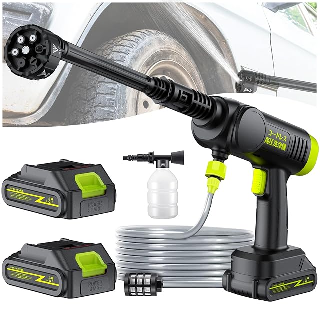Zyvrexコードレス高圧洗浄機は、7Mpaの強力水圧と13mの長射程で車・駐車場・ブロック塀などの頑固な汚れを簡単除去!大容量バッテリー2個付きで最大50分連続使用可能、6in1多機能ノズルで洗車から苔除去・水やりまで幅広く対応。節水設計(水使用量20%削減)でエコに配慮し、軽量コンパクト設計で女性でも楽々操作。電源不要で屋外作業も安心のプロ級洗車機です